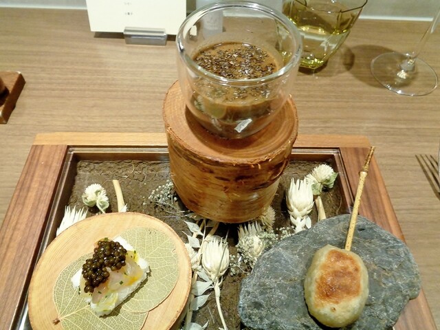今回のコースのテーマの1つに熊食べ比べがありました。ただ和名で熊がついてるだけで穴熊と熊は生態的には違うんでしょうけど。穴熊はジビエのコンソメでポッシェして野菜などと共に鍋のようなスタイルで。