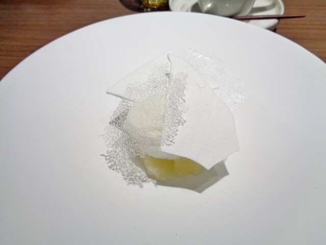 デセールは新任の女性パティシエールさん。ミルクレープ。ドレッセがイカしてますね。小豆アイスを模したレンズ豆のグラスやヨモギパウダーなど。これからが楽しみなパティシエさんです。