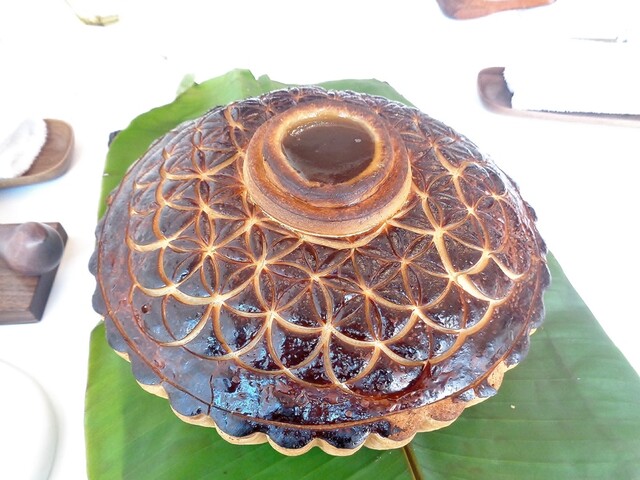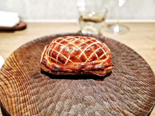 2皿めはシェフ曰く"ラチュレのチキンライス"。見た目だけで言えば海南鶏飯っぽい?みたいな。鳩半身とタイ米を合わせてヴェッシーのキュイソンをスープにして注いだ物。即興らしいですがシェフらしい遊び心。タイ米の香りがヴェッシーのキュイソンの香りと良い相性。味変でブーダンノワールに魚醤加えたペースト添え。前にタテルヨシノさんやラ・トゥーエルさんで鳩のポトフとか食べたけど鳩と香り高い液体と合わせた料理は個人的に相当好きでこれもめっちゃ良かった!