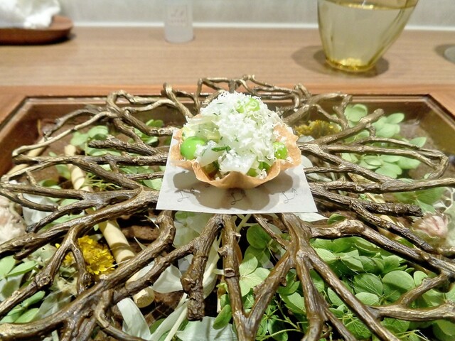 前菜1は脂の乗った鯵を表面だけ炙った物に緑の春野菜を合わせて。ソースは冷製のベアルネーズをイメージした物にエストラゴンのパウダーを合わせて。