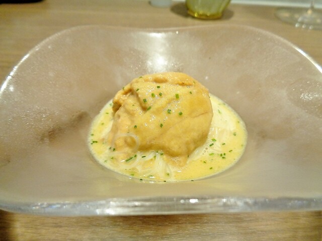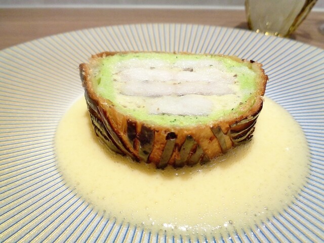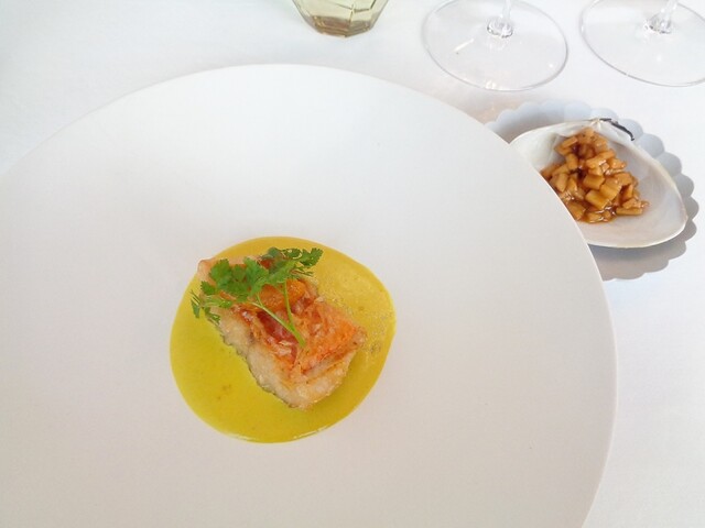アミューズ2はトウモロコシのムースとある手法によって透明に澄ませたジュレ。利尻産の雲丹。トウモロコシの方には全く砂糖を入れてないらしいですがめちゃくちゃ甘味が強い。昔にくらべトウモロコシ自体が甘くなってるようですがそれにしても凄い。