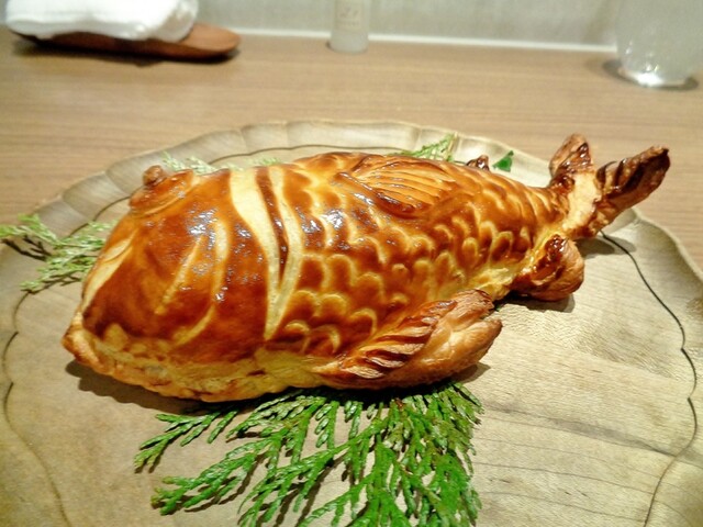 雉鳩のパイ包み焼きは撃った時に落ちて木に脚が引っ掛かった状態を表現してるという。
