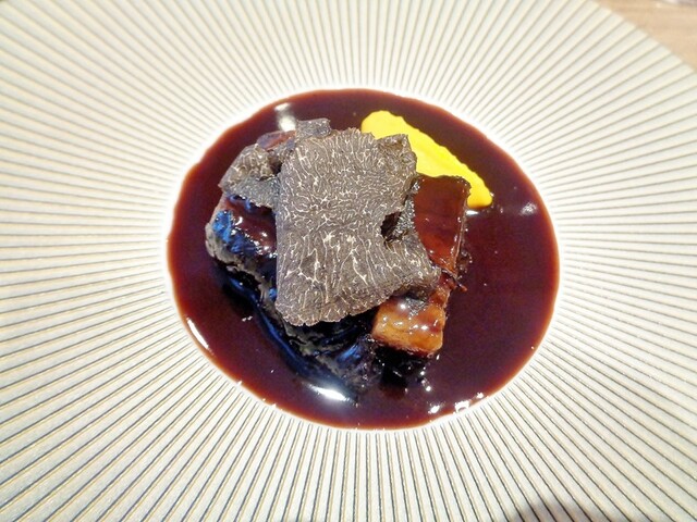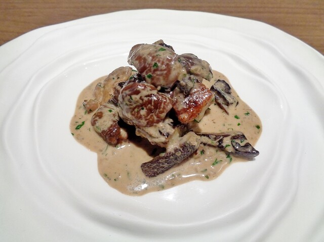 前菜3は猪の金玉のフリカッセ。一人一玉分。ジロールと合わせたフリカッセ仕立て。言われなければ睾丸だとわからないくらい。リードヴォーに近い食感かも。トリュフの香りも良いですね。