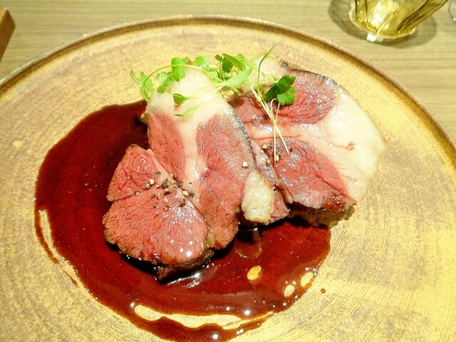 魚はフランス産ルジェ。このご時世に奇跡的に入荷があったという。シンプルにポワレ。通常ムールでやるマリニエールを北海道産のアサリで。私はサフランが好きなんですが、強めの甲殻類の出しやフュメ・ド・ポワソンじゃないとサフランが立ち過ぎてどぎつい場合があります。スープ・ド・ポワソンやブイヤベースなど以外に平目のポワレのムールマリニエールとかでそういう経験が多かった。しかし!こちらのバランス感が凄く良い。ムールじゃないのも良かったのかも。そもそもルジェ自体がちょっと甲殻類っぽい香りがあるのでサフランが合わないわけがないですね。感無量。