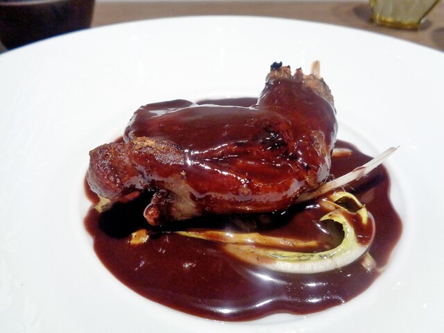 魚料理はスペシャリテ鮎のパイ包み焼き。この時期の定番です。ですが毎年少しづつ変化も感じます。多分毎年食べてますが本格的に美味いと思い始めたのは3年前くらいから。ずっと前は鮎の味、香りを楽しむのにこの仕立てである必要があるのか疑問でしたがそれがクリアされた感じです。今回お連れ様から「パイ包みには夢が詰まってる」と名言を頂きましたが確かにそう思いました。ある一ツ星の店のシェフにパイ包み料理の意図と利点を聞いた事があります。そのシェフは様々な素材を同時に食べられる事が最大のメリットと仰ってました。確かに理論的にはそうかもしれないし納得は出来ましたが、何となく完全には消化しきれなかった。しかし夢が詰まっているという一言で全てに合点がいきました。アミューズのリエットとは違い内臓は使わず繊細な味と香りを楽しむ料理。ソースはブールブラン。