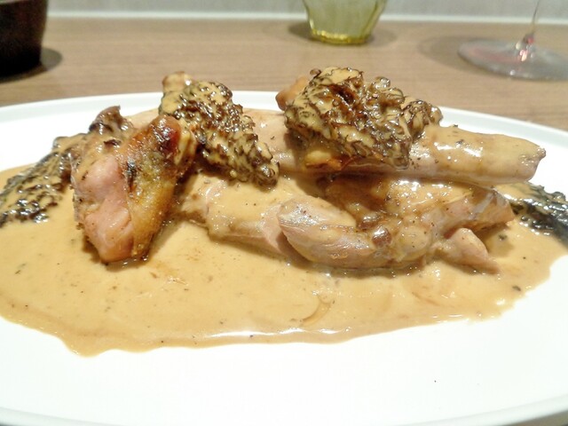 半身づつで仕立てを変えて2皿構成。一皿めは内臓などを入れたサルミっぽいソースにヴェッシーを刻んで加えた物。これは超美味い。前にジビエで頂いたサルミに牡蠣を合わせたソースの時以来の衝撃かも。実際何度かヴェッシーを頂いてみて思ったのは特に身の方には膀胱の香りのような物は移らないような印象でどちらかと言えば真空調理としての要素がほとんどなのかなと。しかしソースに加えると香りがしっかり移ってかなり素晴らしい具合に。鶏の場合デカイのもあるし、時間の問題もあったりでスペシャリテでやってたアサヒナやフランスの有名な店も事前にほぼ火入れしておいてから膀胱で包んで加熱する店がほとんどでヴェッシーと言えば今はパフォーマンス的な要素がほとんどなのかもしれない。こちらは生から加熱しておりしかもキュイソンはいうまでもなく完璧。鶏ではよくドゥミドゥイユにしますがそのイメージでドゥミドゥイユにはしてないけど中にトリュフも加えてあります。因みにatableもプーレのアンティエを生からベッシーで火入れしてました。