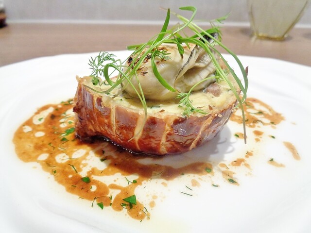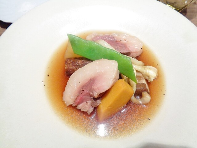 前菜2つめは海亀と猪ソーセージのカスレ。こちらは普段からカスレをやるようなレストランではないですがシェフご自身がお好きな事もあり当然出される物は美味いです。海亀のゼラチン質はカスレに向きます。猪ソーセージから出た脂もアリコブランが吸って美味いです。カスレの要は脂だと思います。使ってる物は全然違いますが(笑)パッションのカスレに匹敵すると思いました。