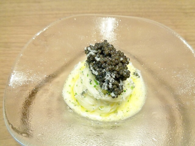 アミューズは今年やたらフランス産のが入荷の少ないホワイトアスパラを使ったブランマンジェ。ポッシェしたホワイトアスパラにキャビアと合わせて。