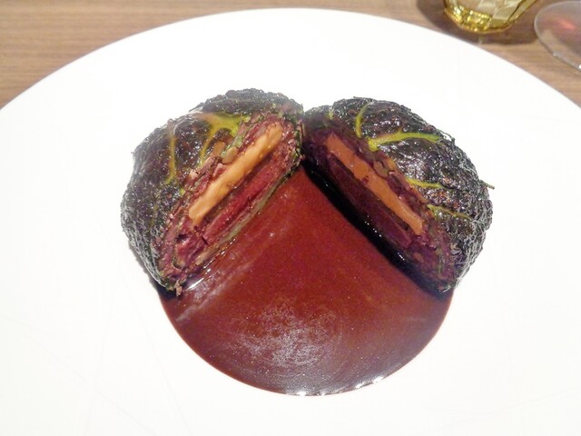 メインは雷鳥のシューファルシ。去年か一昨年辺りからシャルキュトリー協会主催のシューファルシ大会が開催されその審査員をシェフがしてたという。それで他所のシューファルシに刺激を受けて自分も最近やりはじめたとか。特徴としては"シュー"ファルシなのでキャベツを食べる料理なのでキャベツを主張する為ペルドロー・オ・シューのように層になって内側にもキャベツが入ってる。粉の生地と違ってキャベツからは水がでてファルスが水っぽくなってしまいますが焼いてあるので中の肉々しさもしっかり保たれてます。秀逸でした。