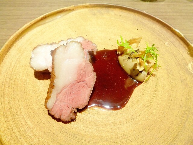 メインは千葉県産のエトフェのピジョン。シェフの猟場の近くの養鳩場らしくまだ飼育始めて2~3年だとか。最近見たあるお店では同じ産地のこの鳩が半身で5000円だったのでこちらは超安いです。胸肉は大きくなかなかのサイズです。去年こちらで頂いた北海道産のエルムピジョンより超絶美味い。脂が乗ってます。身がトロけるようで味の濃さが凄い。国産では随一、ラカン産とタメ線かそれ以上。ソースはサルミではなく血を入れたソース・オ・サンとでも言えば良いのかとにかソースも超美味い。素晴らしい