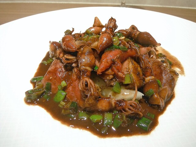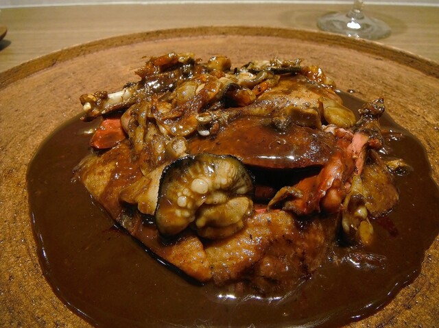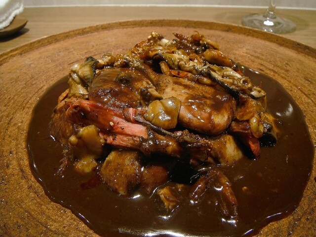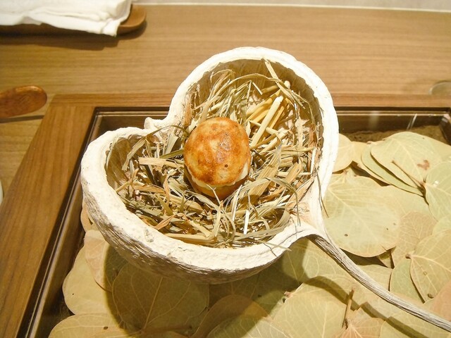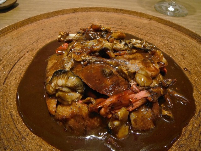 1ヶ月熟成のペルドロールージュを1羽ロティ。今年は輸入物も使用してるが今年は国産ジビエが少なかったり身が痩せてて使えないなどの経緯があるようだ。合わせたのはアサリから取ったダシをパセリバターでモンテし、白菜や原木ナメコ、鱈の白子と合わせた。スープの方にはペルドローの香りは移してないらしいが凄い一体感!身との不自然さが一切ないこの感じはかなり衝撃的。今は進んでペルドローのルージュはまず食べる事はないがこういう食わせ方ならイケてます。そういえば数ヶ月前に20年以上前のフランス料理の本に載ってた【蛤のポッシェと鳩のポトフ】という料理が食いたいと某店シェフに写真を送りつけた事があったがそれに近い料理だったかも。さすが。