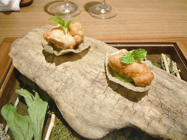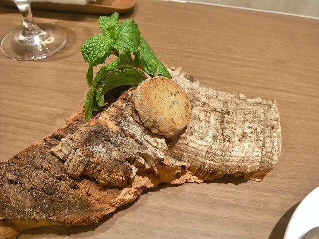 部分はセル・ダニョー。野草などを合わせたパン粉を纏わせ脂分だけ最後にポワルで焼きを入れた物。身の方には直にアセゾネはせずに別添えの岩塩を付けて頂く仕立て。今回は主素材は当然として野草のポテンシャルの高さに目覚めた気分。