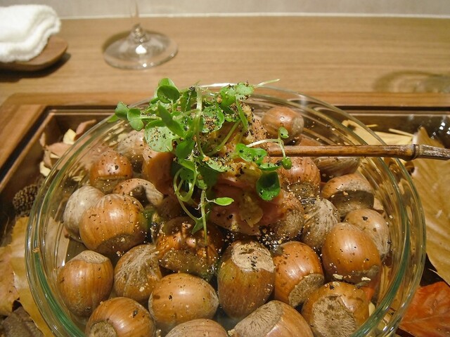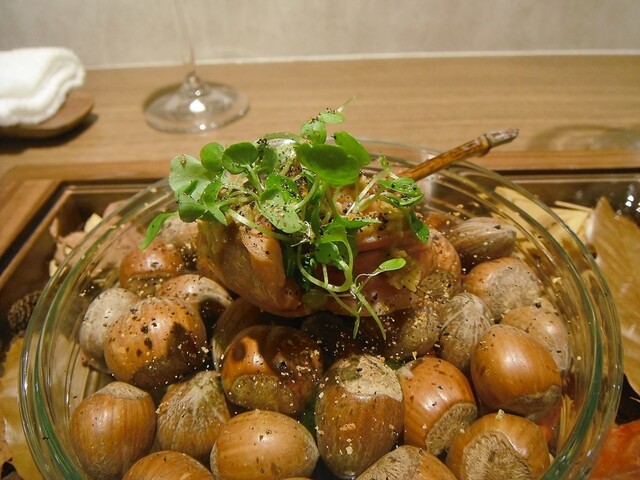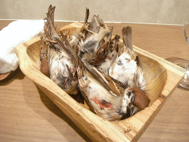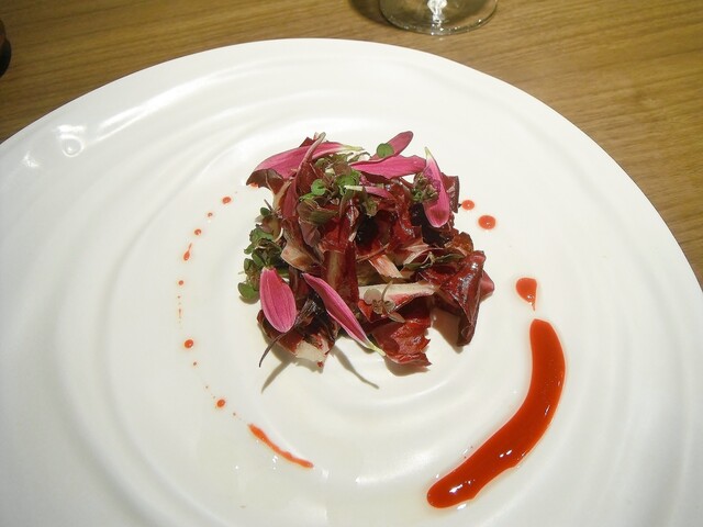 シェフが前日に捕ってきたという雀をチャコールで焼いてアンディーヴとクルミでサラダ仕立てに。