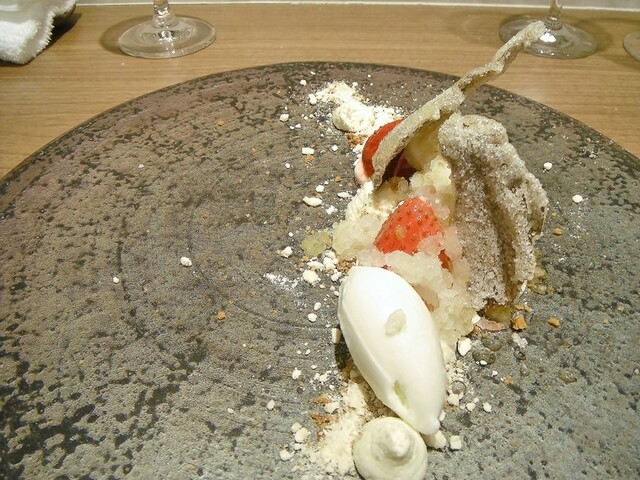 一ヶ月熟成の雷鳥をベッシー包み。ソースは少し軽めのサルミ。香りはやはりなかなかパンチ効いてます(笑)いつもより低い温度で一ヶ月熟成させたという雷鳥とベッシーの香り、どっちが一つ突出するのではなくちょうどフラットな感じで融合してる様な。キュイソンは敢えて少し深めですが食感は良い。通常ベッシーと言えばブレス鶏、アレンジしてもペルドロー、フェザン、家禽のピジョンなどかと思いますがむしろ雷鳥の方が合うのかな?とさえ感じるような仕上がり。素材そのものの香りも残すというのは本来の調理法の意図するところとはもしかしたら違うのかもしれない。香りがぶつかってるという表現にもなるかもしれないがしかし素材″も″活かすという流れから見ても非常に意味のある物だったと思う。素晴らしい。