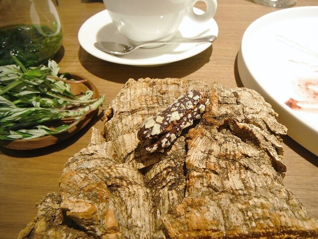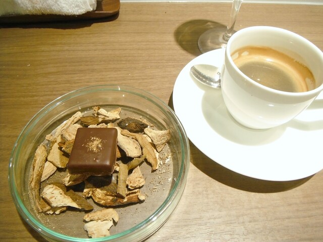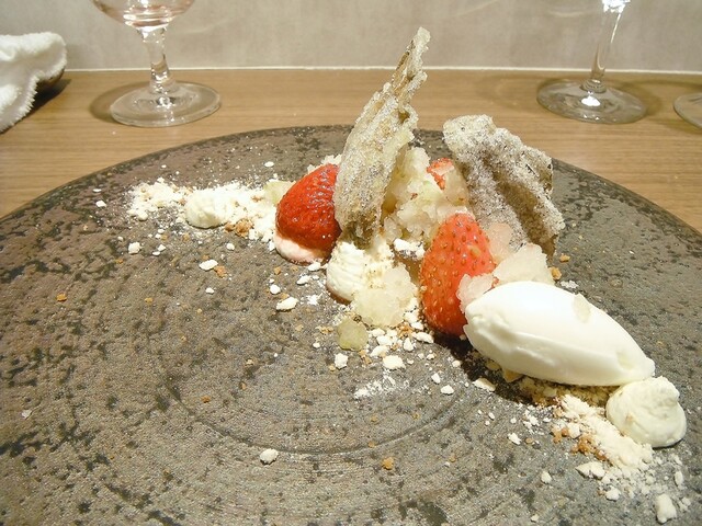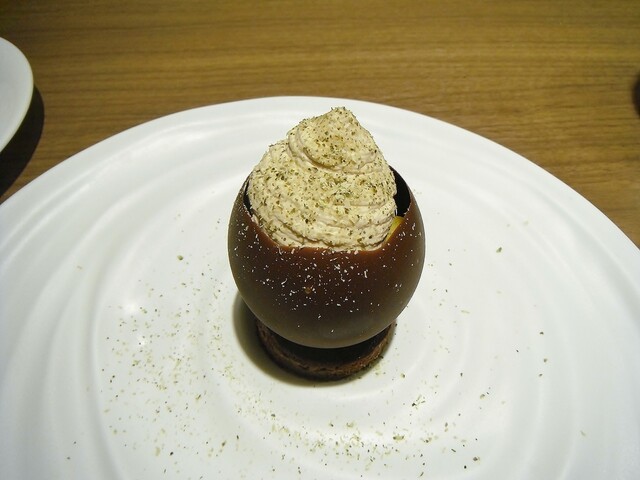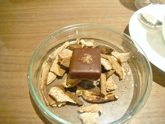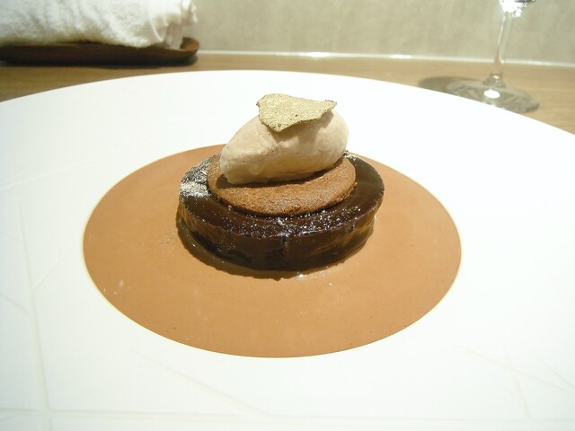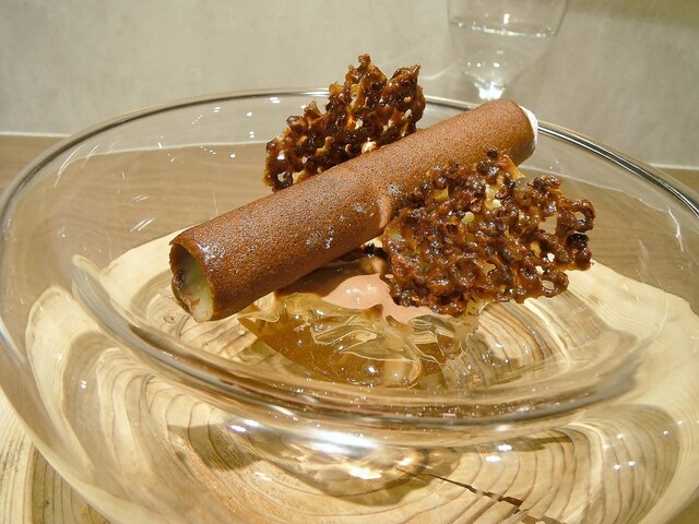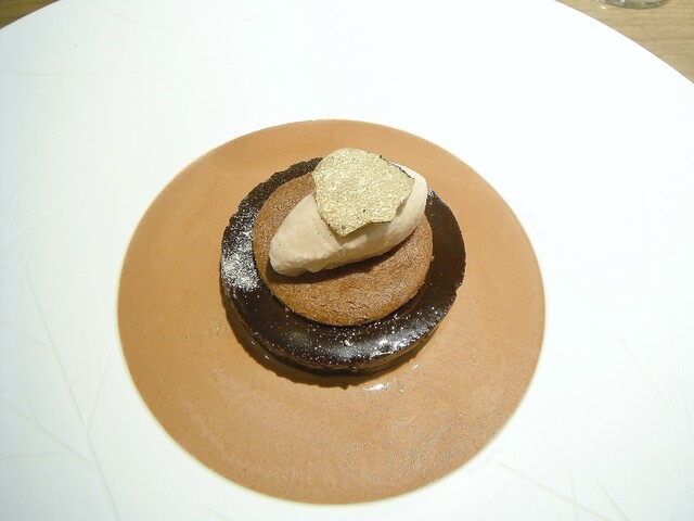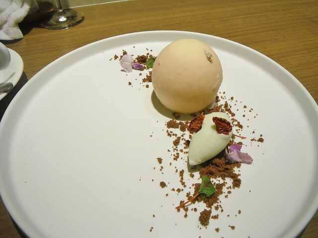 ガトーショコラの上にチョコレートの器。その中に昆布から抽出したダシのアイス。マンゴー、チョコレートのブリュレ。上に削った昆布。パティシエさんがチョコレートにアミノ酸の旨味を加えた物が好きらしく、そこで自然の物でアミノ酸を足せないかと考えたところ昆布のグルタミン酸を足したそうだ。こういうクリエイティブさは非常に素晴らしいと思う。ジャニス・ウォンでは茗荷とかベーコンと合わせたりしてたが、チョコレートとの組み合わせに無限の可能性を改めて感じた瞬間だった。