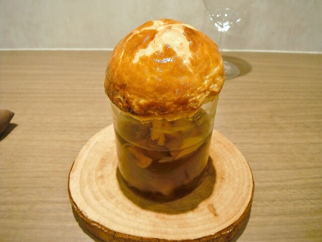 タルトジビエはパテアンクルートの時とは違うアーモンドプードルを使ったパートシュクレ。基本的にパテアンクルートなどは仕上がってからファルスを寝かせるような事はせずにフレッシュな状態だという。しかしながら毎度ジビエらしい香りがしっかりある。ここら辺が他所との圧倒的な差でコンソメジュレに関してはその都度風味の強弱はあるものの毎回パートの食感を保ちつつファルスにしっかりジビエ香があるのは凄い。パテアンクルート自体それほど拘って食べてはいないがここのなら何度でも食べたいと思わせる。