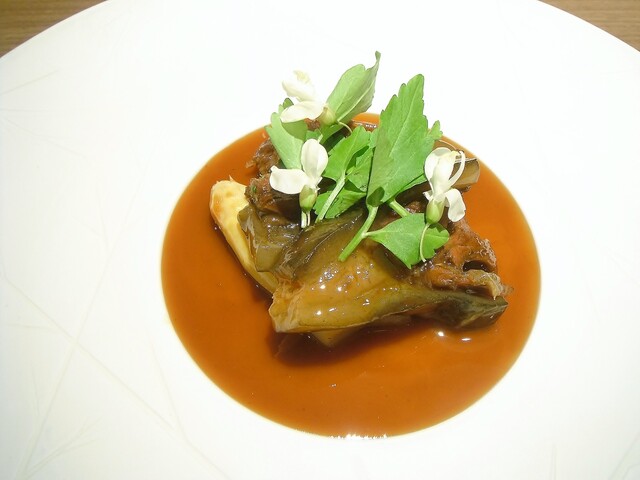 海亀は前ヒレの部分を煮込んだ物に吉野シェフスペシャリテのソーストルチュ。鼈だと養殖物だと魚っぽいニュアンスも強いがこの海亀は完全に赤肉と言っても差し支えない肉々しさとゼラチン質。確かに赤ワインなんかで煮込んでも良さそうな肉質の力強さがある。