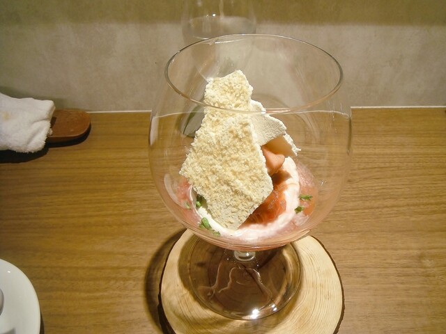 まずは今が旬というフランス産のルバーブのパフェ。単体でも当然美味いが合わせた垣通しの茶との相性が良かったのが面白い。狙ったのかわからないですけど某ジャニスウォンみたいなティーペアリングとしても成り立ってると個人的に思いました。