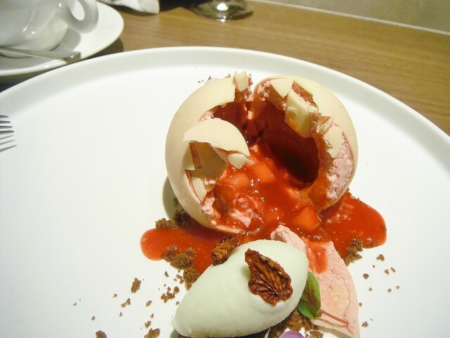 続いては球体という意味のスフェール。よく見るのはチョコレートのスフェールに熱いフランボワーズのソースを掛けて溶かし中を露出させる物だが、演出の要素が強く皿上での構成はいまいちな印象が強い。しかしこちらは冷製の仕立てで中にフランボワーズのソースがたっぷり入っておりアシェットとして見た目も味もしっかり両立させてあったと感じました。現状何が出るかわからないデセールの楽しみがある店としては唯一と言えるかも。