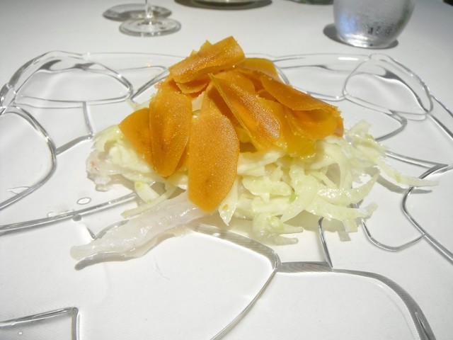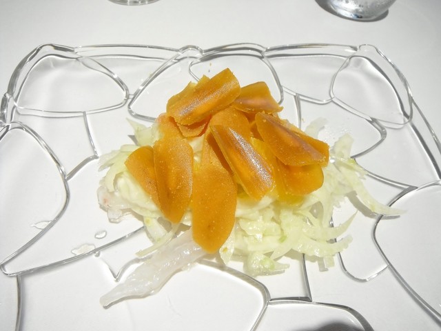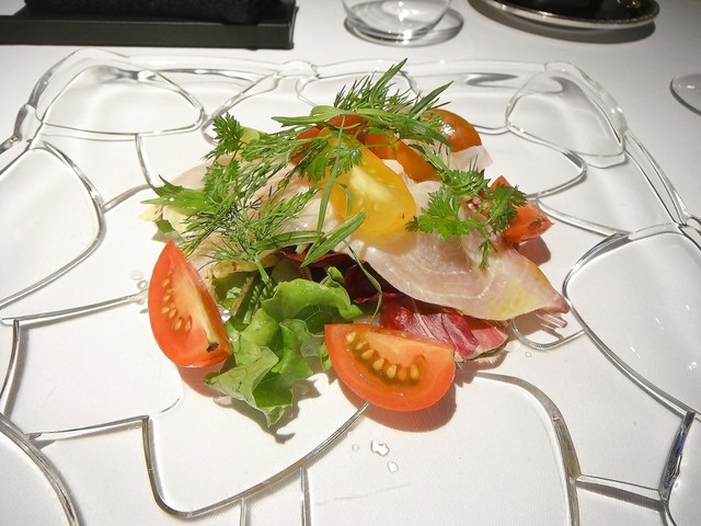 ・前菜1 鮃のカルパッチョとフィノッキオ、カラスミのサラダ