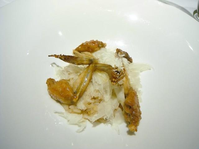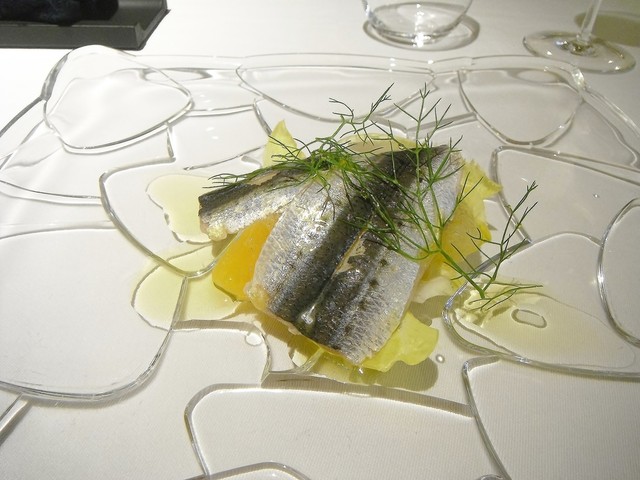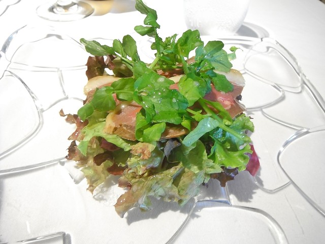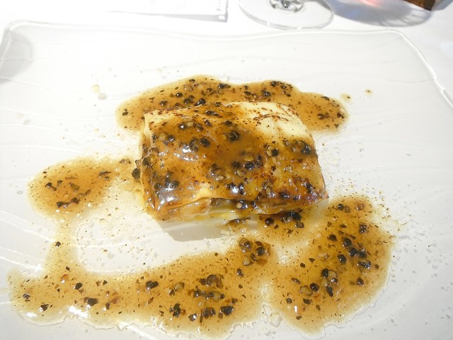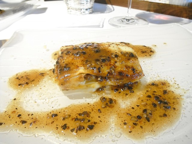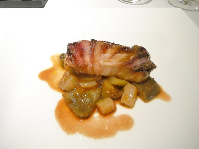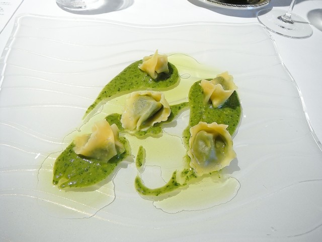 通常であれば冷菜→温菜の流れになりますが、食べて欲しい物で構成したとの事で温→温と続く構成になったようです。花ズッキーニの中にはモッツァレラにアンチョビ。ソースはサルサヴェルデ。時期的に仏、伊問わず花ズッキーニを頂く機会は多かったですが最も美味かった。アンチョビが入る事で旨味が格段に上がります。サルサヴェルデも多くは彩り程度の存在感しかない物が多いが、これはかなり美味しい。こちらのシェフは皿の上に意味の無い物は絶対に乗せない。ちゃんとそれがある事の説明が出来る料理であります。