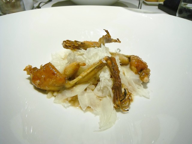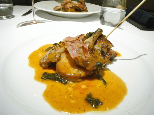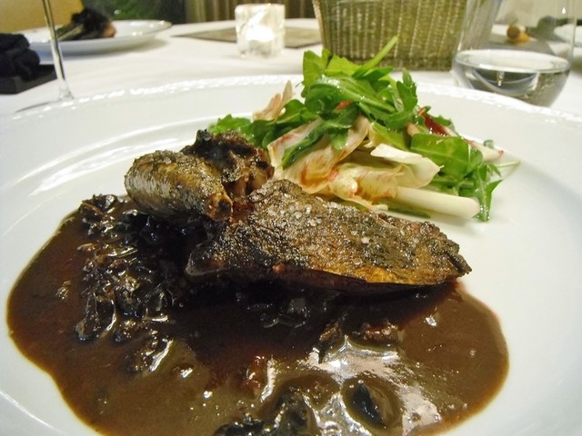 島根県産のヴァローナを真空で2ヶ月置いた物。ソースにはアバも入ってるが2ヶ月も経ってるとは思えないほど綺麗な味わい。身は脂肪感なくかなり筋肉質。弾力が強くカットに結構手こずるが身の旨味に関しては正直なところジビエでも最も高価な部類のパロンブより美味い。直近で食べたヴァローナは飼育物で雉に近い白身だったがこちらはセルヴァジーナらしく力強い赤身で数年ぶりのヴァローナを実に堪能出来た。