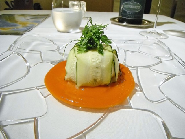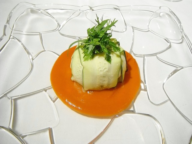 formatoフォルマートは形造るとか型に入れるみたいな意味があり、Sを付ける事で反対の意味、形が無いという意味になる。ゴルゴンゾーラと野菜をピュレ状にしそれを薄くスライスされたズッキーニに包む。ソースはパプリカ。これは凄く一体感を感じる一皿でしてどれか一つ欠けても完成しないような印象。スフォルマートとパプリカが合わさった時の風味の豊かさが素晴らしいですね。