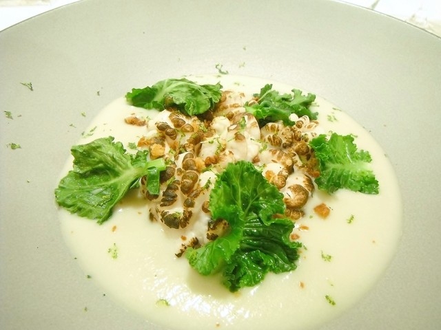 欧州料理というのは皿の中に主素材以外に付け合わせが存在する。それは野菜そのものだったりピュレだったり。元々その付け合わせる意味というのは当然あり、酸等でリセット口変わりする意味合いや組み合わせる事により一つの料理として完成する物などシェフにより考えがあるのだと思う。しかしそれを食べ手側に意識して食べさせるのはプロの仕事としては失敗だと思ってる。何の説明もなくとも視覚的、厳密には料理の配置で食べ手側が意識せずとも皿の中の流れとして自然に食べさせ、完成させる事こそがプロであると常々思ってる。