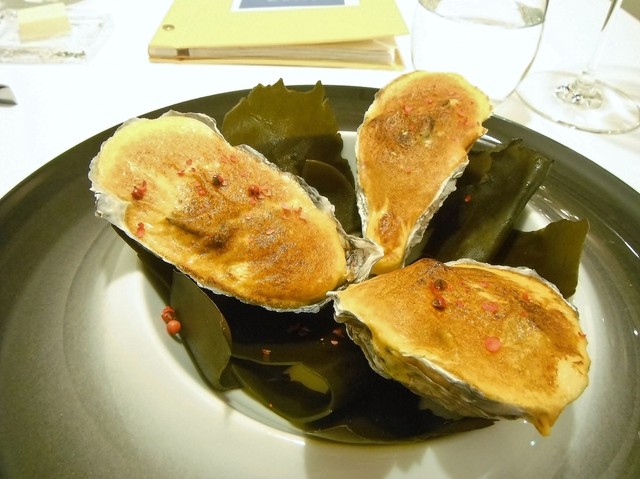 こちらは昆布のサヴァイヨン。下にあおさ海苔。下に敷いた昆布から立ち上る香りと牡蠣とあおさの磯っぽさで海の情景が浮かぶよう。