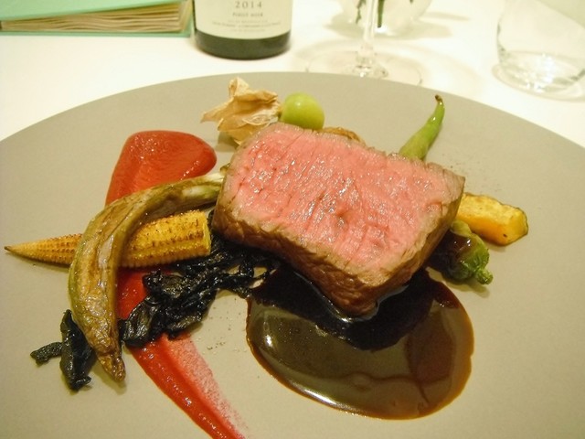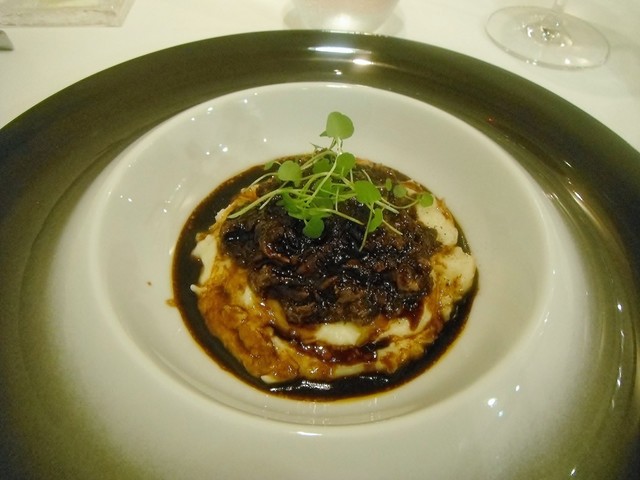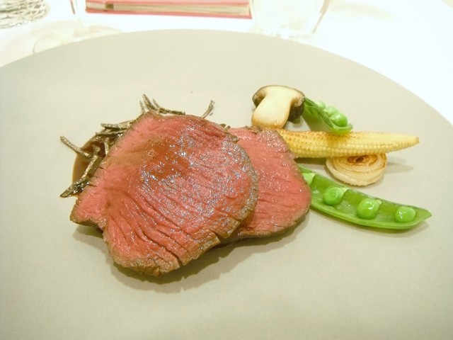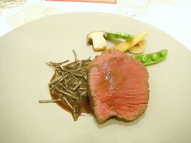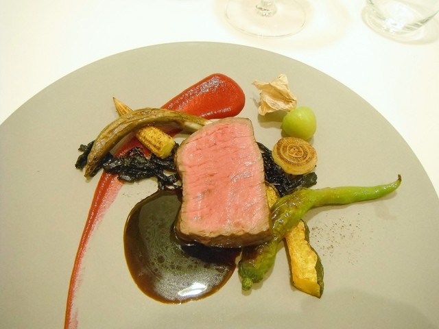 阿蘇王は赤牛。部位はランプ。土着品種で土佐の物より原種に近い物だという。多分シェフはこちらがフレンチでの牛を好まない事を知っているかと思いますが、そこを敢えて牛をぶつけてきた自信のほどが伺える逸品だった。しっかり取ったフォンと合わせた赤ワインソースの旨味はいうまでもない。素晴らしい。