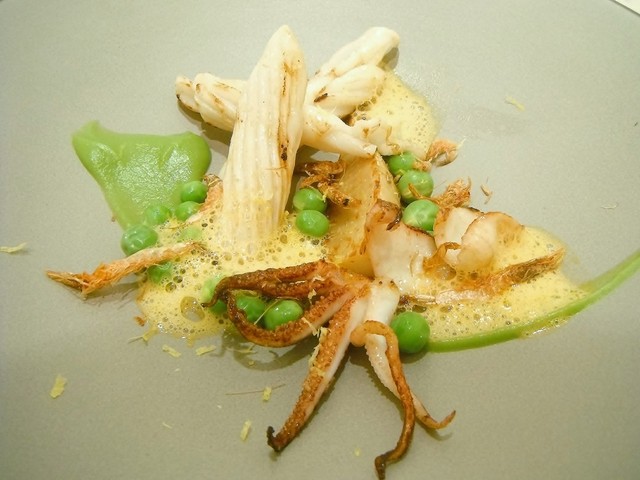 桜海老や伊産プティポワ、筍などと合わせ季節感のある一品。焼いたヤリイカの香りと味にプティポワ