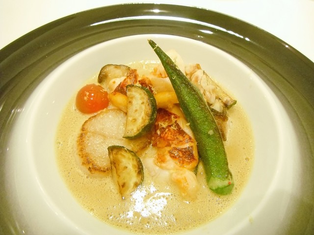 オマールブルー、帆立、甘鯛はブイヤベース仕立て。香りが強く激ウマ。一般的な物より濃度がありそれはじゃがいもでリエした物だという。