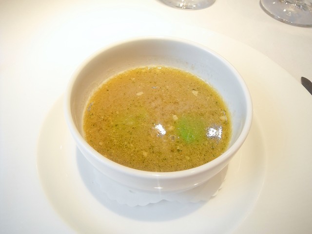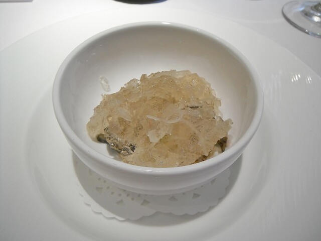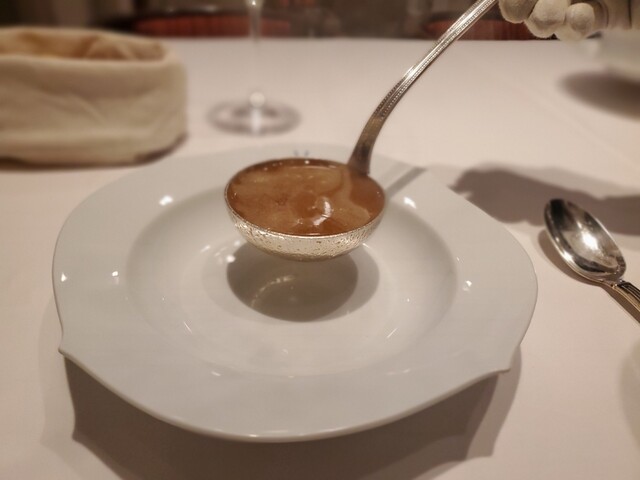 鼈のスープは親交のあるシェフから買ったというもので、ビビるくらいデカいサイズだったそうな。2度に分けて加熱した物で計6時間ほど蒸したそうな。血も入ったスープですがクリアな味わい。ゼラチン質がやはり凄いですね。