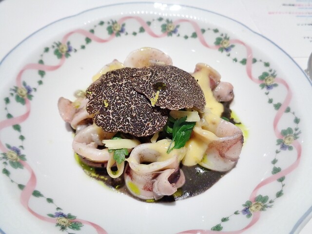 京都府産子持ちヤリイカの温製 タケノコ添え マッシュルームのソース