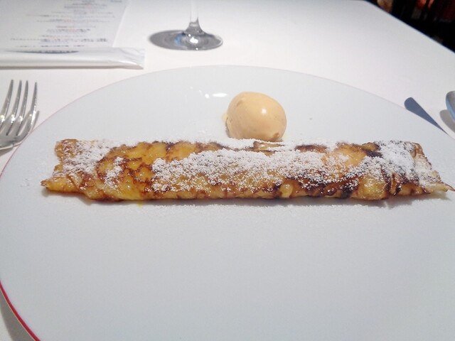 クレープオテロは数年ぶりに復活させたとか。一般的にはクレープ生地は合わせて30分以上~寝かせてから焼くのですがこちらでは前日に合わせてグルテンを出した物を当日営業前に焼いておくそうです。結構もっちりした食感出したい場合は事前に焼く事が多い気がしますね。パティシエールも以前よりもったり感だして全体的なクレープとのバランス感が上がったような気がします。