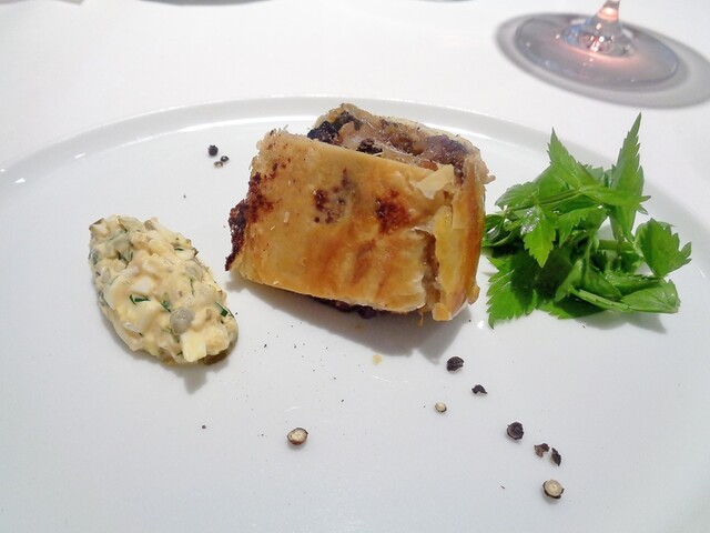 牛アキレス腱とエスカルゴ、セップのパイ包み焼き。これももちろん美味いですが、意外というかパイ包み焼きにタルタルソースを添えてあるのは初めてでした。酸の口変わりが目的。ケッパーが刻んでなくて丸ごとでエストラゴンの香りもあり固形感もあるのでガルニ的な感じで確かによく合っていました。