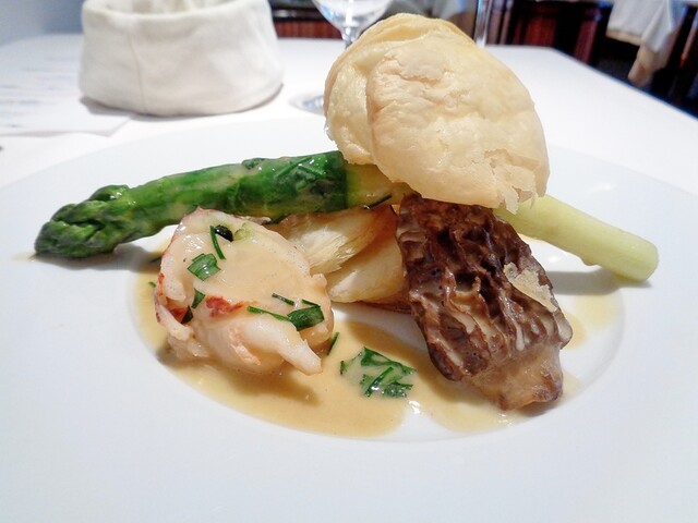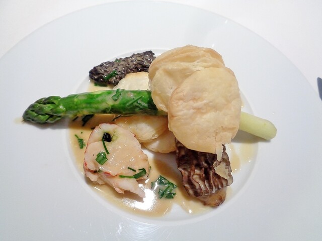 ・グリーンアスパラガスとモリーユ、オマール海老のバター風味