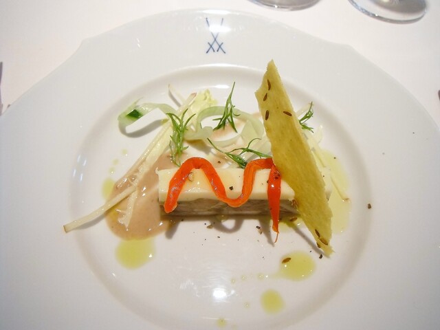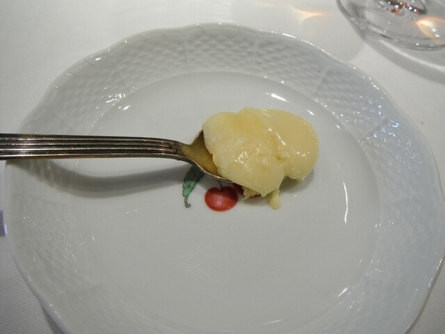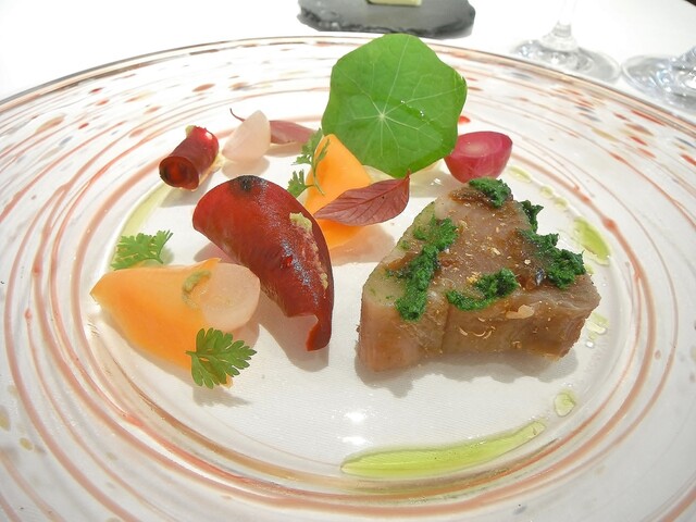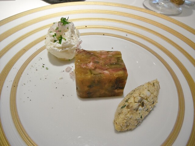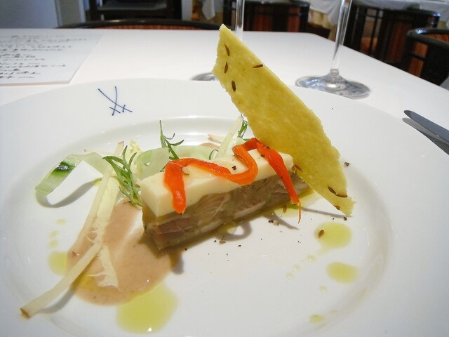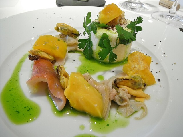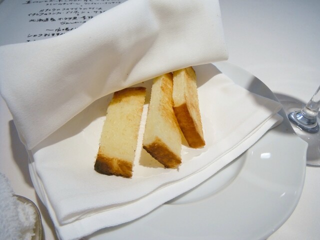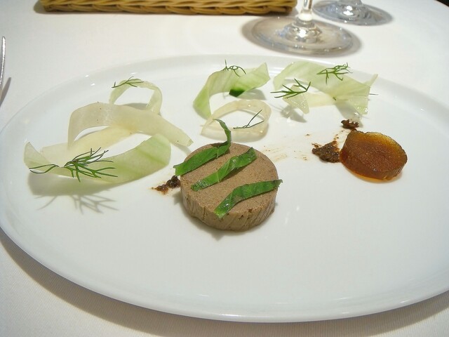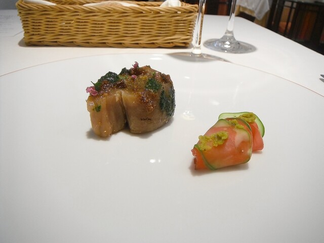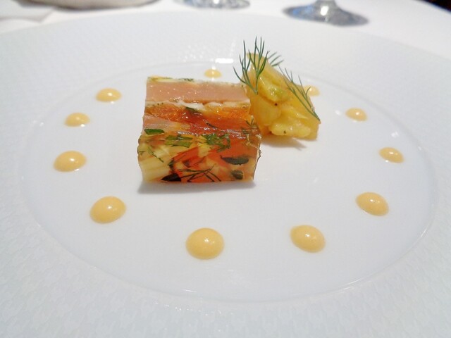 ほぼ魚介のみで構成されたコースの中にパテ・ド・カンパーニュを挟む。結構細か目に挽いた肉で滑らかなタイプ。肉の風味が良くて個人的にもとても好きなタイプでした。