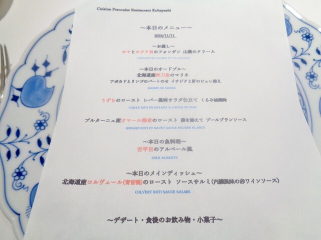 頂いた料理はコルヴェールをメインにしたジビエコース1万円