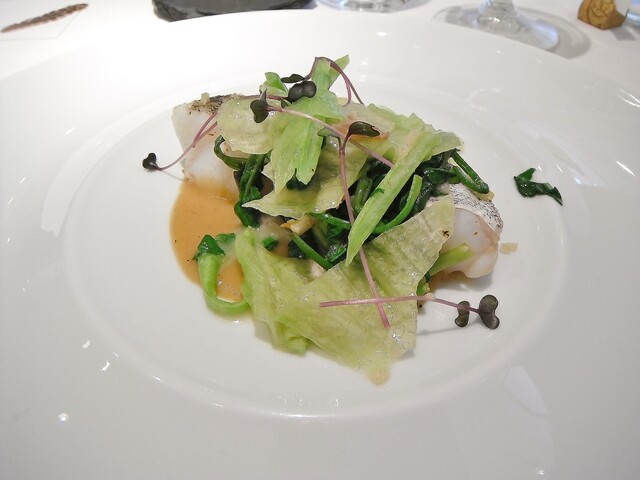 北海道産マダラの蒸し物 レタス・クレソン添え エシャロットのコンフィのソース