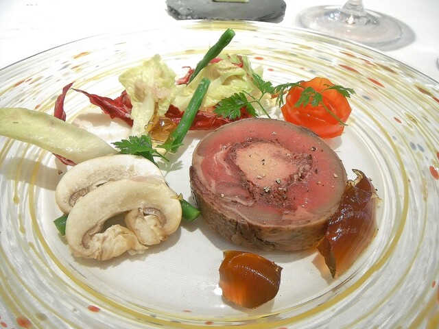 フランス ラカン産鳩のバロティーヌ ジビエのコンソメゼリー いんげん豆・マッシュルームのサラダ添え