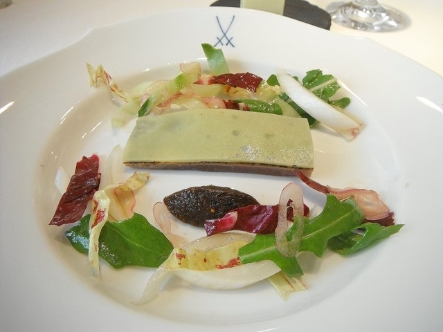ウサギとフォアグラのユール ソーテルヌワイン風味 ダイコンのマリネとレーズン ルッコラのソース