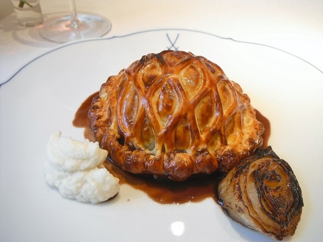 ジビエ(青首鴨・山シギ・山鳩・山ウズラ・雉)のパイ包み焼き 根セロリのピュレ ヴァニラ風味のオニオン添え ソースサルミ