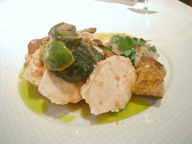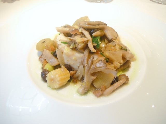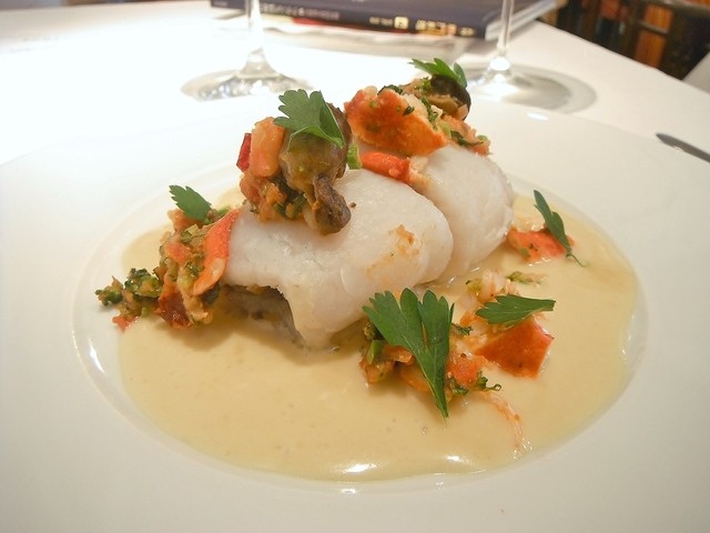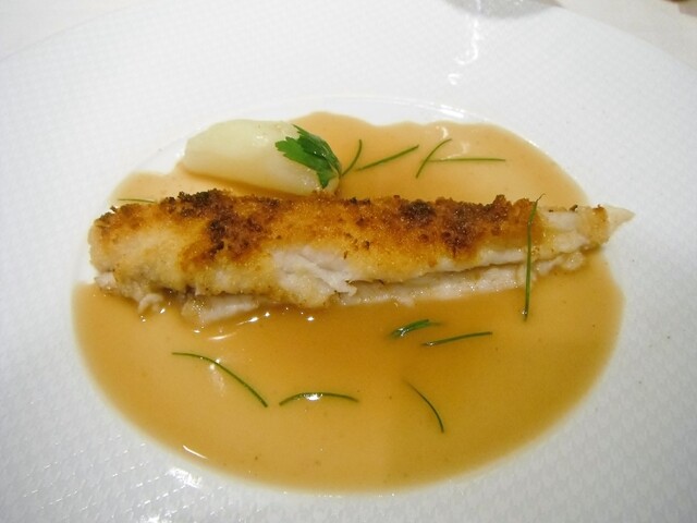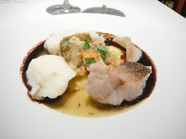 魚は赤舌平目。シェフは赤舌を好んで使います。黒に比べ小さめですがヴァプールなど蒸す、煮るような調理法に向くのはこちら。魚介類だけでコースを構成してもらった事があるほどこちらの魚介料理は好きです。