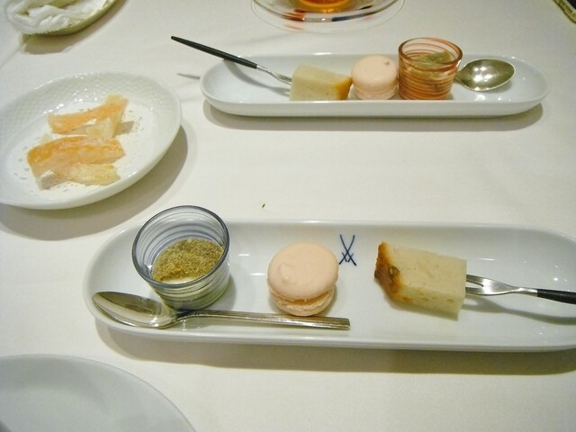 アミューズ、前菜5、魚、肉、デセール、ミニャルディーズといった内容。