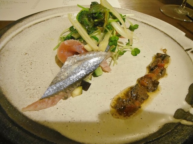 表面だけ軽く炙ってある厚切りのゴマサバは脂が良く乗っててまた合わせた茗荷の千切りとかちょっとニンニクの効いた何かのピュレとかの相性が素晴らしい