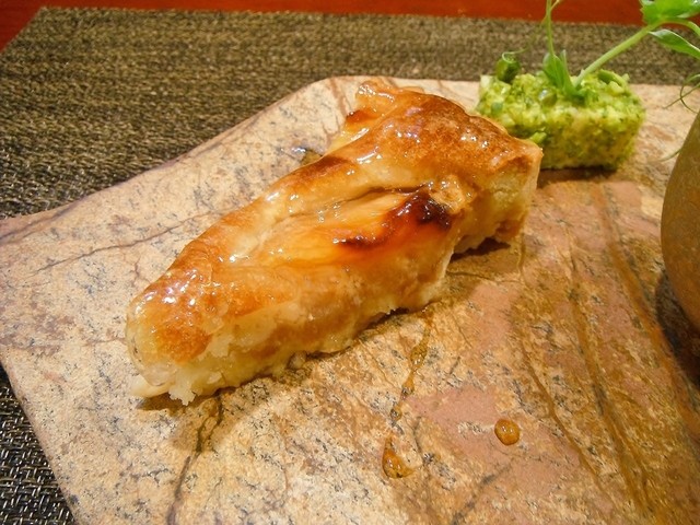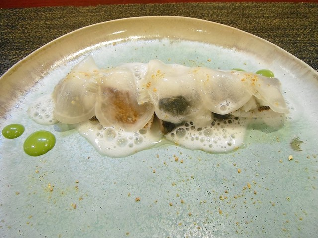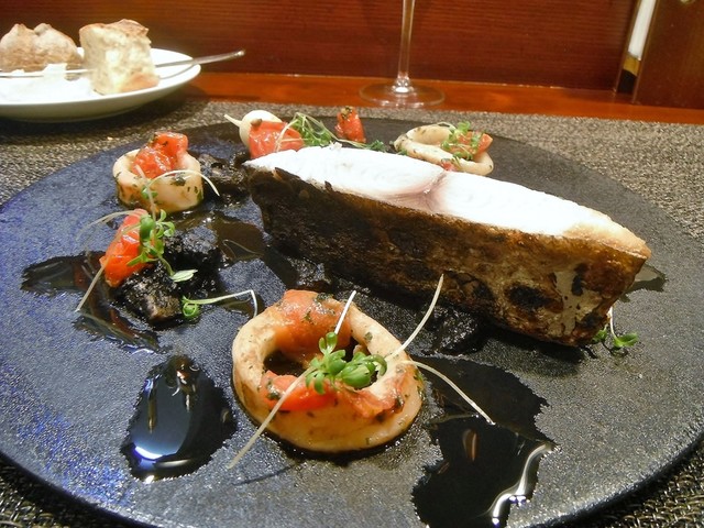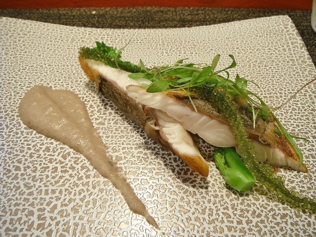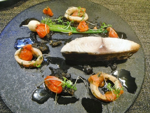 魚は鰆。まず火入れが良いですね。皮目はしっかり焼けていてスッと切れる。パサつきやすい身ですがしっとりしてます。イカスミが好きなんでこの仕立ては良かったです。