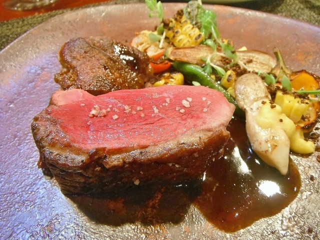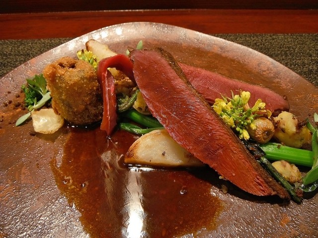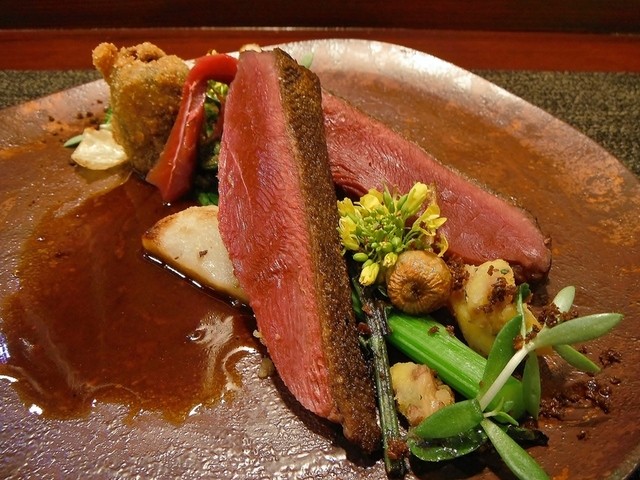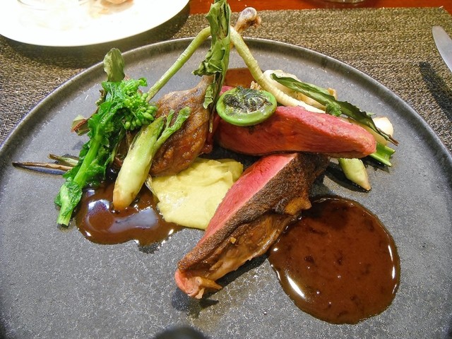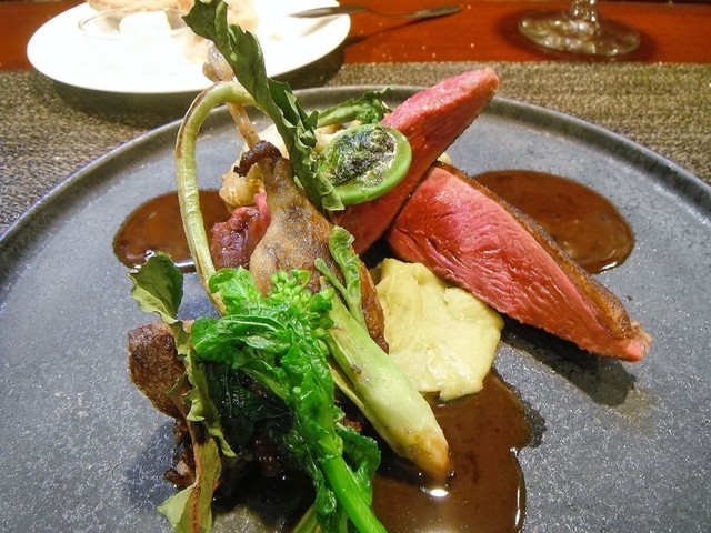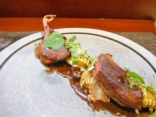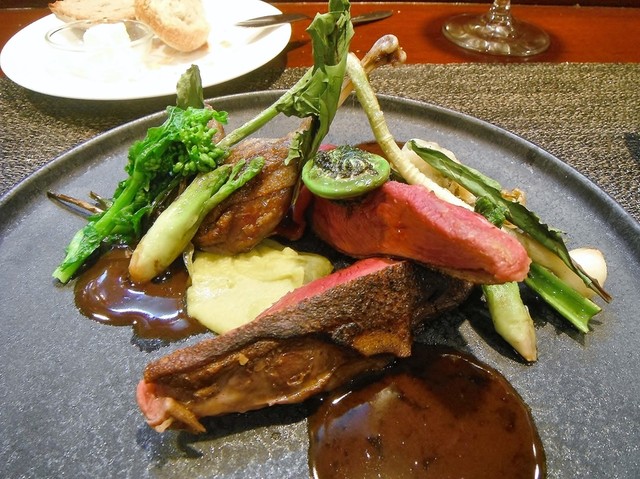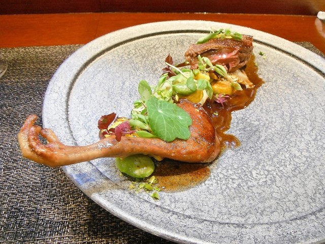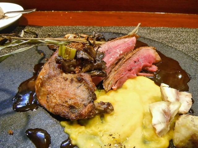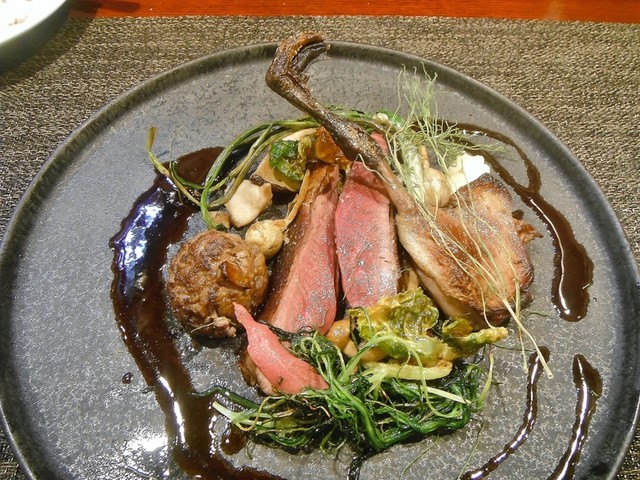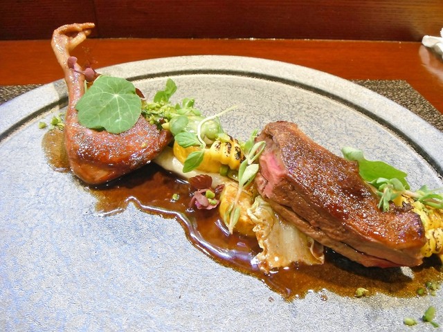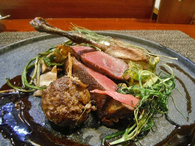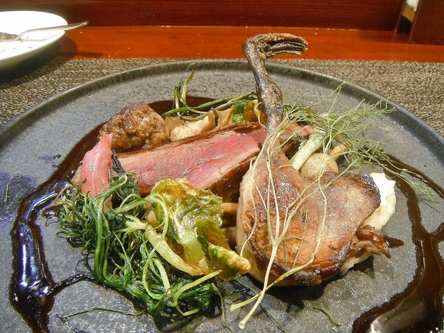 ずっと頂いてみたかった尾長鴨。値段安っす。キュイスの発達してる鴨系はロティだと固くてたべづらいがコンフィにしてあるんで骨からスルスル抜ける柔らかさで更に味も詰まってます。コルヴェールよりもレバーっぽいニュアンスの胸肉も美味しい。ソースもやはり初訪の時より好きです。猪、鹿、フォアグラのハンバーグ添え