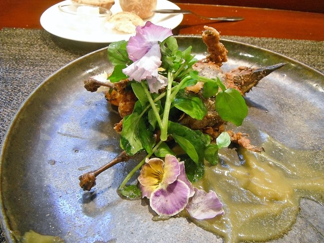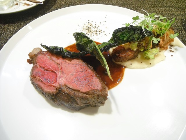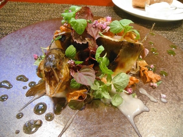 京芋のフリットとケッパー入りのブールノワゼット、所謂グルノーブル風と言われるソースで。白子のムニエルみたいな料理の遭遇率は非常に高いが香ばしいフリットとソースが非常に良い感じでそこら辺にある料理とは確実に一線を画する。予想外にかなり美味しかった。
