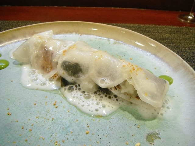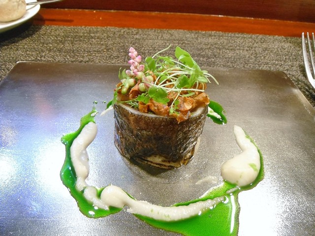 予想に反したビジュアル。確かにどっかで見た事あるようなビジュアルではありません(笑)。ロール状の秋刀魚の中に更に秋刀魚やエシャロット。パセリのオイルに根セロリのピュレ